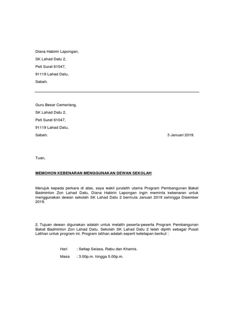 Contoh Surat Memohon Kebenaran Menggunakan Dewan Sukan Sebagai seorang siswa memang berhak menentukan untuk sekolah dimana. Beberapa contoh surat rasmi memohon kebenaran pulang terbaru 2019. Sop pkpb bagi penganjuran majlis keramaian kemaskini 18 disember 2020 1.